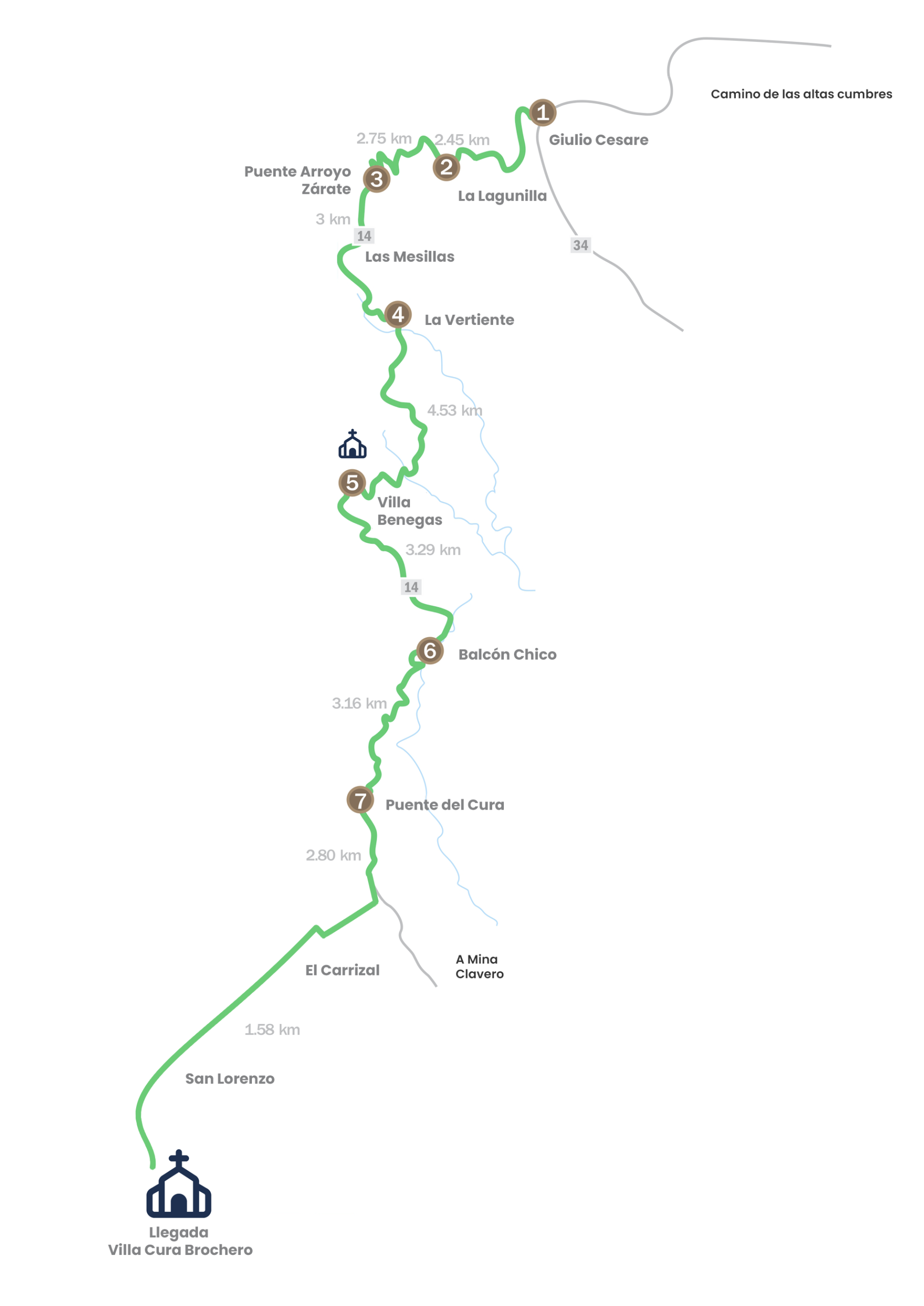 Este recorrido es un trayecto de unas seis horas de caminata, donde se realizan paradas en ocho estaciones construidas para la reflexión y oración de los peregrinos. Cada una de ellas, ubicada a unos 4,5 kilómetros, una de otra, están identificadas por un gran tótem de hormigón de 6 metros de altura, coronado con piezas de metal rústico que forman la imagen de una cruz que eleva la figura de Brochero Santo al cielo.